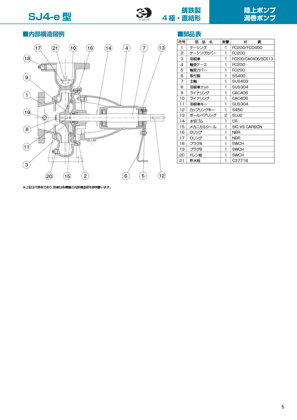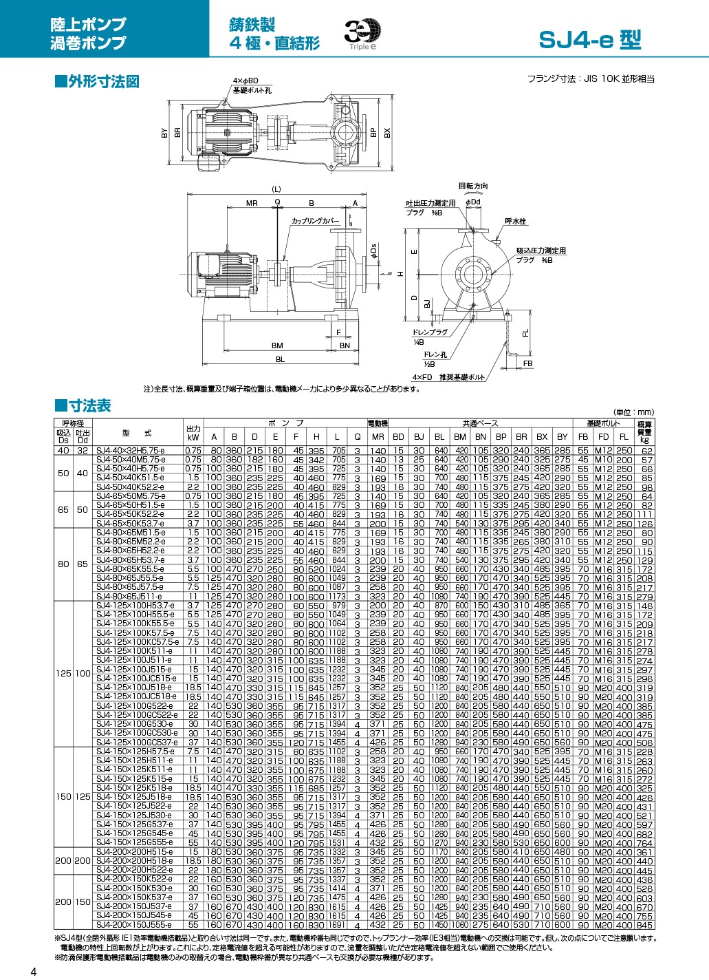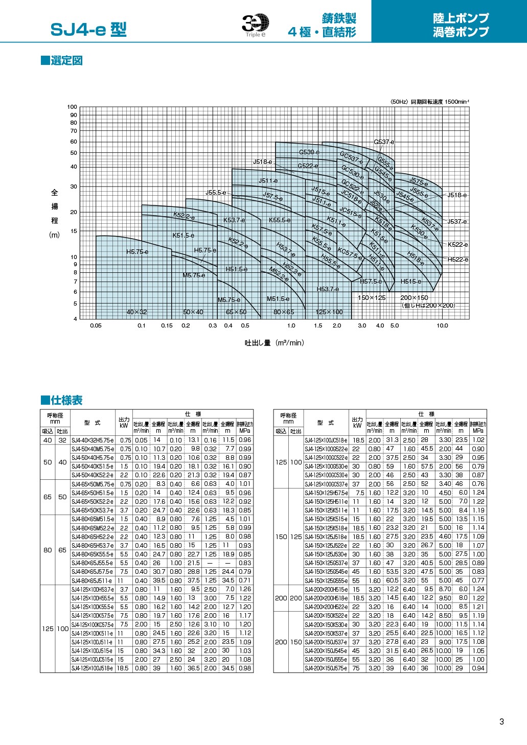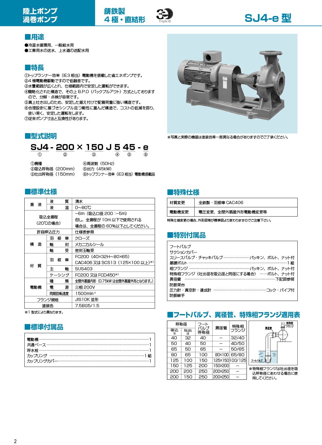 顶端运行效率(IE3 相当)电动机构造的节能泵。4 极电动机驱动,低噪音。水量范围广,可在规格范围内稳定运行。